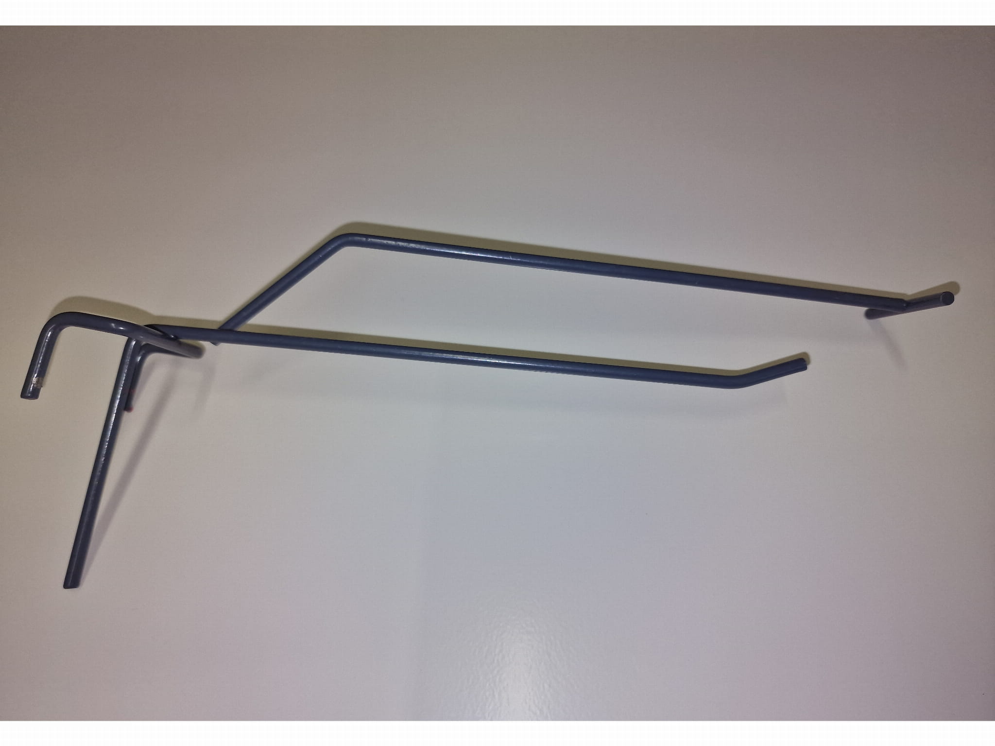 Zawieszka pojedyncza L-200 mm na kratę, malowana. Zawieszka posiada wysięgnik na etykietę cenową.