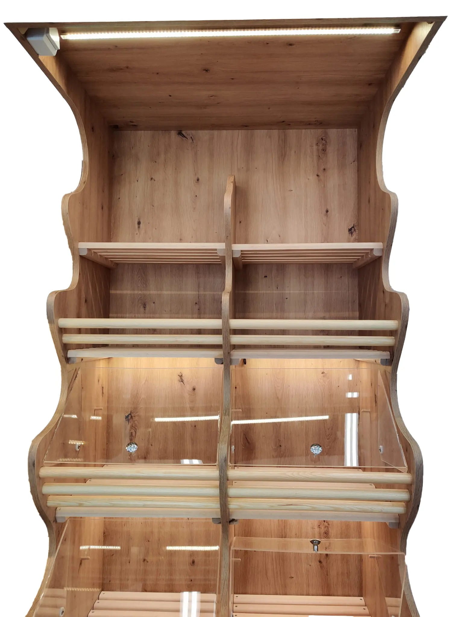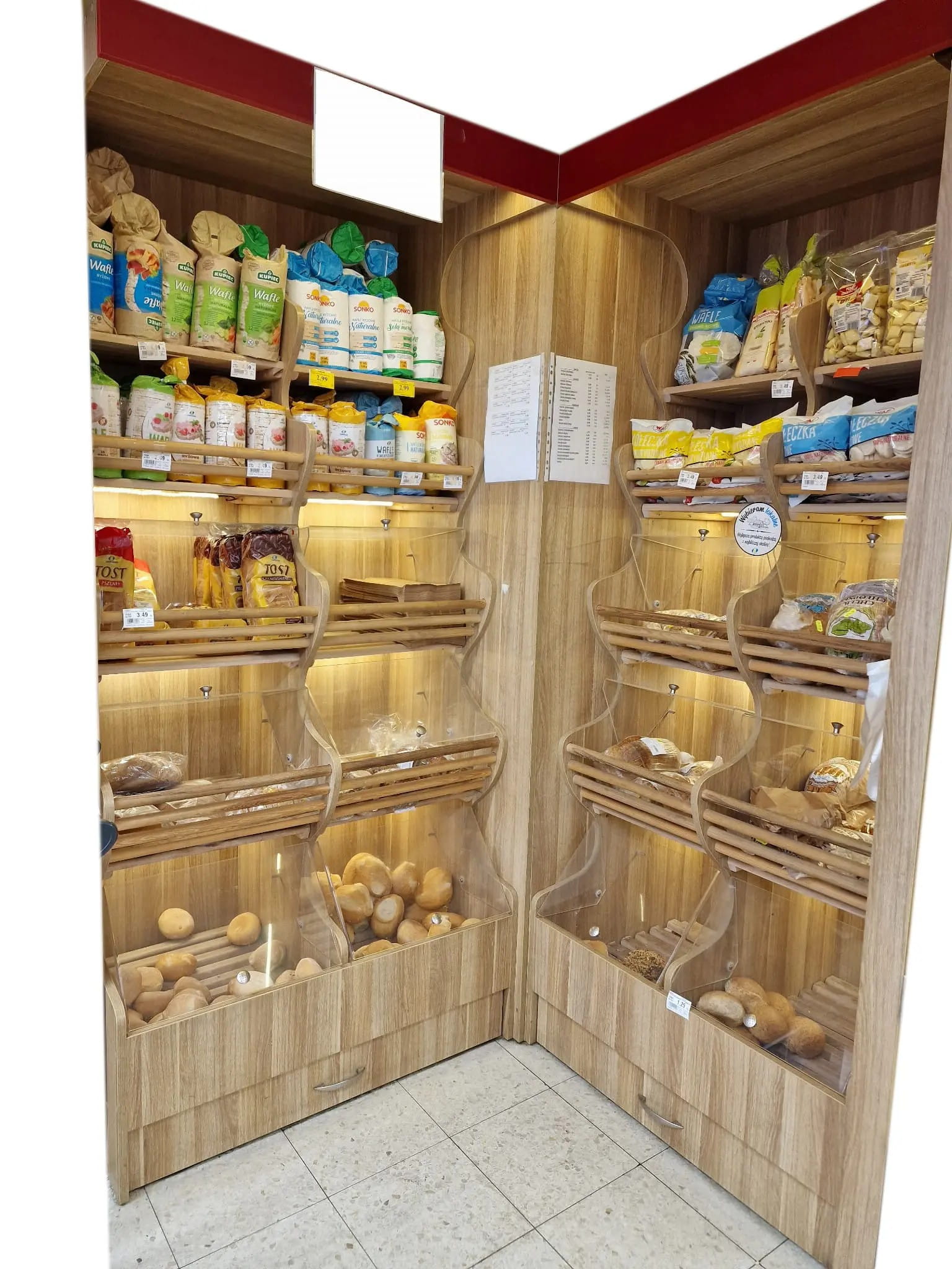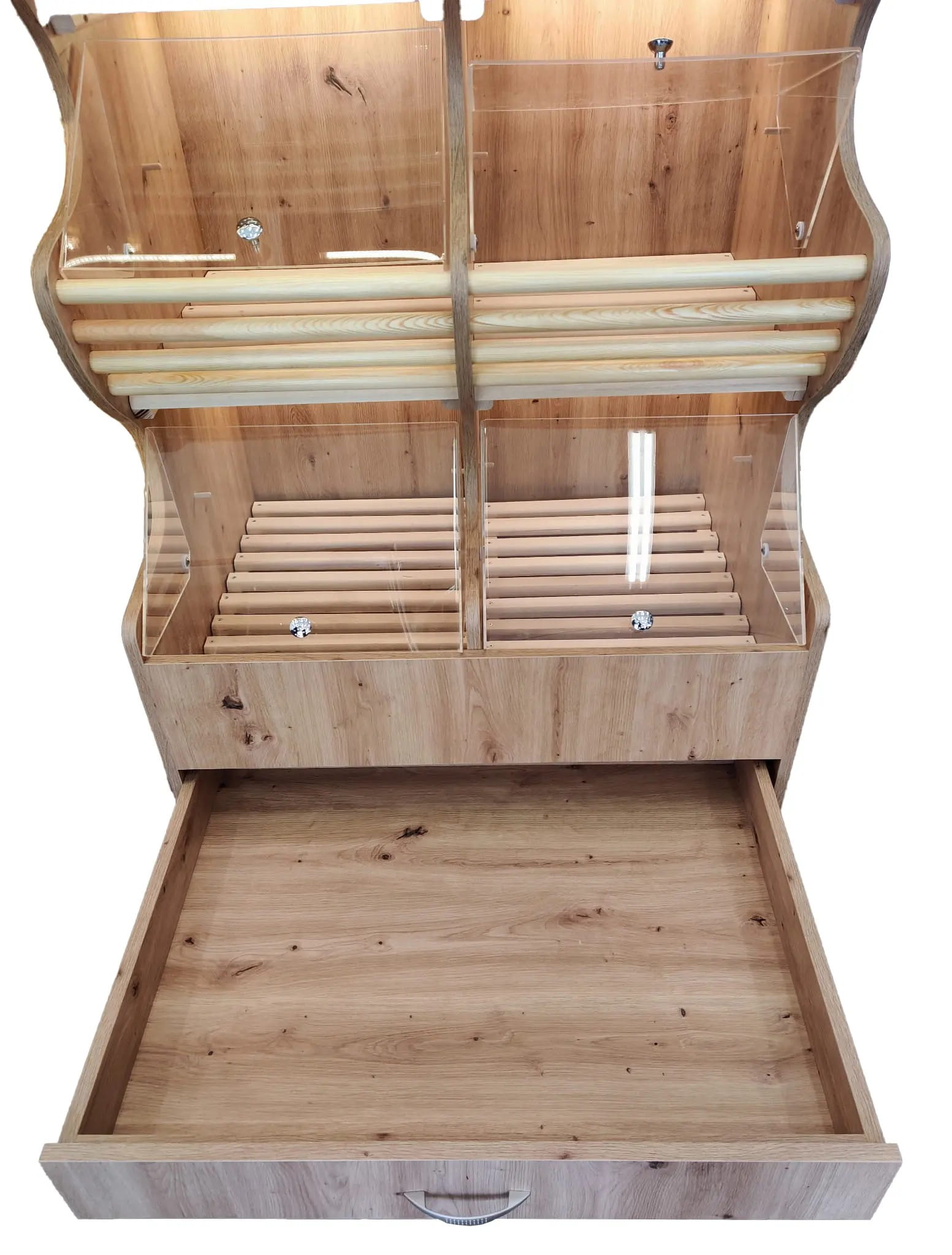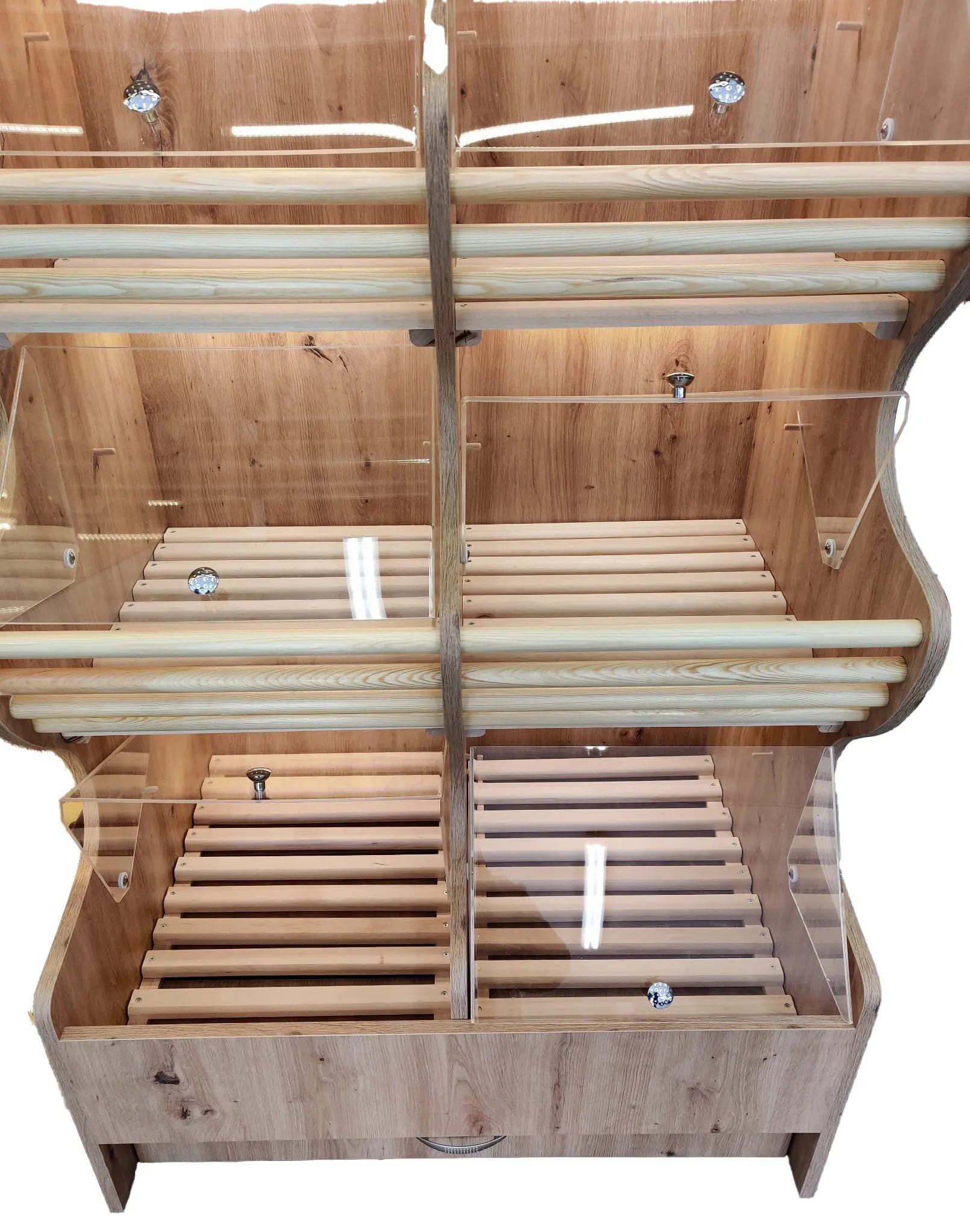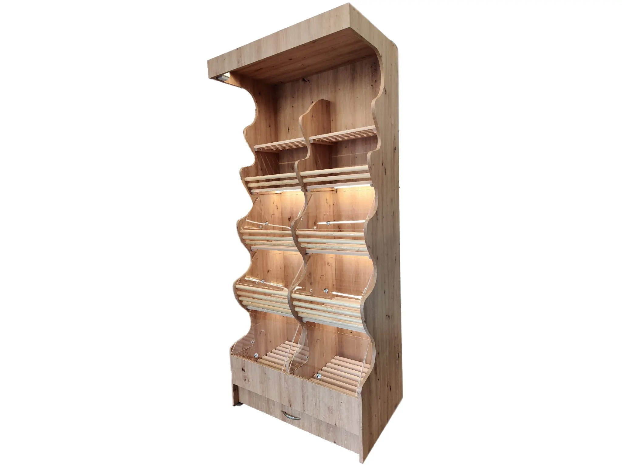 Półki drewniane (szczebelki), z pleksą do samoobsługi